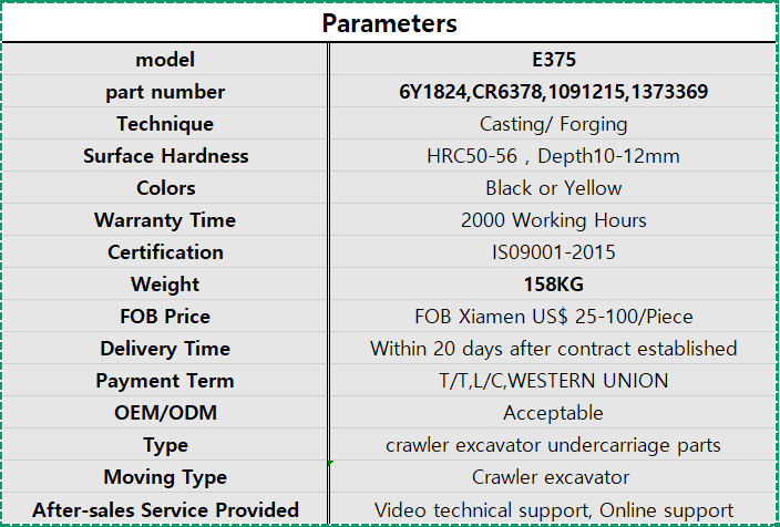 model Caterpillar-E6015B part number 430-4192 Technique Casting Surface Hardness HRC52-58,Depth10-12mm Colors Black Warranty Time 4000 Working Hours Certification IS09001 Weight 296KG FOB Price FOB Xiamen port US$ 25-100/Piece Delivery Time Within 20 days after contract established Payment Term T/T,L/C,WESTERN UNION OEM/ODM Acceptable Type crawler excavator undercarriage parts Moving Type Crawler excavator After-sales Service Provided Video technical support, Online support -