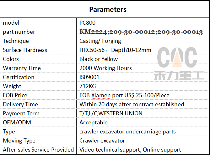 Parameters model PC2000-8/-11 part number 21T-30-00211 Technique Casting/ Forging Surface Hardness HRC50-56,Depth10-12mm Colors Black or Yellow Warranty Time 2000 Working Hours Certification IS09001-2015 Weight 330KG FOB Price FOB Xiamen US$ 25-100/Piece Delivery Time Within 20 days after contract established Payment Term T/T,L/C,WESTERN UNION OEM/ODM Acceptable Type crawler excavator undercarriage parts Moving Type Crawler excavator After-sales Service Provided Video technical support, Online support -