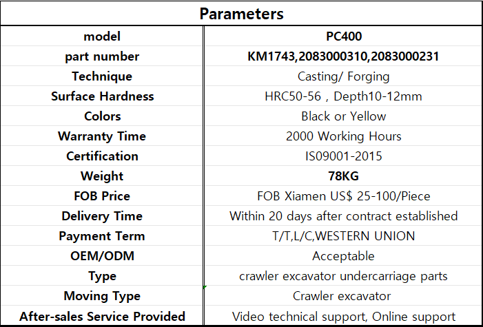 model XCMG950 part number Technique Casting/ Forging Surface Hardness HRC50-56,Depth10-12mm Colors Black or Yellow Warranty Time 2000 Working Hours Certification IS09001-2015 Weight 1300KG FOB Price FOB Xiamen port US$ 25-100/Piece Delivery Time Within 20 days after contract established Payment Term T/T,L/C,WESTERN UNION OEM/ODM Acceptable Type crawler excavator undercarriage parts Moving Type Crawler excavator After-sales Service Provided Video technical support, Online support