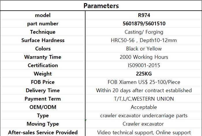 model CLG950 part number 46A0292 Technique Casting Surface Hardness HRC50-58,Depth10-12mm Colors Black Warranty Time 4000 Working Hours Certification IS09001 Weight 83KG FOB Price FOB Xiamen port US$ 25-100/Piece Delivery Time Within 20 days after contract established Payment Term T/T,L/C,WESTERN UNION OEM/ODM Acceptable Type crawler excavator undercarriage parts Moving Type Crawler excavator After-sales Service Provided Video technical support, Online support -